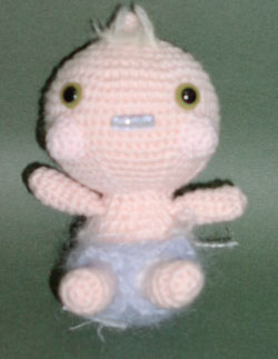 No.026 タイトル:赤んぼう天使くん 作者名:田嶋弥生 生まれたての天使・・・・ということで 羽を透明なコードと毛糸をあわせて編んでみました。 孵化したばかりのセミのように、 しばらく透明でくしゃくしゃなままという感じを 出したかったのです。 天使といえば、うまれたときから天使なのではなく、 頑張ってなるのかなと思ったのが、 きっかけでした。 赤ちゃんなので、オムツとオムツカバーしてます。 とりはずせます。