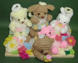 No.082 タイトル:天使の花園 作者名:梅津弘子 花の中にいる天使たちなので、 花とたわむれている感じを出しました。 あみぐるみたちは、こま編みでしっかり編み、 服は長編みで風合いを出して編みました。 花はカラフルな色を使ってみました。
