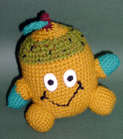 No.099 タイトル:キウイくん 作者名:キタムラユカ はじめてで、編み図もなにもなしで作ったので、 気づいたら編み目が裏むきになっていました。 奇跡の作品です。 中身がちょっと見えてて、 かわいくありませんか??