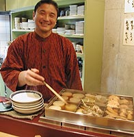 まずは、五条烏丸の近くにある「あんけ」。 お野菜の天ぷらや 小芋のたいたん(煮もののことです)、 アスパラバター焼きなど 野菜のお料理が上手なお店なんですが、 大根のおでん、最っ高です。 細く伸びた入口。京都ならではの風情です。 おでんの大根。しっかり味がついています。