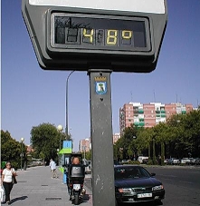 | 『スペインの酷暑はこう乗り切る』 8月のマドリード、非常に暑い。 路傍の温度計に、ついにこんな数字も表れた。 ![]() セビージャなど南でやや内陸の地方では、 ふつうに50度台の気温が表示されているという。 もちろん日向なので実際の最高気温より高いけど、 でも自分が街を歩けば直射日光を浴びるわけで、 そりゃもうまったく本当にたまらんです。 汗をかくのも、もう飽いたばい。 本日の最高気温は41度。 湿度は10%台。 日没はだいたい9時半。 室内の温度計によると夜中1時の気温は34度。 カレーも炊き込みご飯も一晩で腐る暑さであり、 ようやく寝付いたと思っても 苦しくてガバと目が覚めるほど喉が渇く状況。 なんでこんなに暑いかというと、 アフリカのサハラ砂漠から シロッコという熱風が吹いてくるからだそうだ。 おかげで、風が吹いてもちっとも涼しくならない。 ぶおーっと熱風が吹きつけてくるかんじは、 ちょうどエアコンの室外機の前に立ったかのようだ。 そしてスペイン中央部は、 「9ヶ月の冬と3ヶ月の地獄」という諺があるように、 冬の厳寒と、夏の酷暑で知られている。 周囲を山脈で囲まれた中に メセタと呼ばれる標高600メートル前後の 台地が広がっているから、だそうだ。 マドリードは標高約650メートルになる。 手元の外来語辞典で、「メセタ」を引いてみた。 「気温差が大きく、乾燥していて農産物も少ない。 人が住むには適さない。」 ……まぁねー。 こんな、ひとが住むには適さないところで、 みんなどうやって暑さを凌いでいるか。 まず、働かない。 8月は、1ヶ月まるまる休みのひとが多い。 そうすれば、ちょっと山の上だとか、 ちょっと海岸だとかに行って、 わりあい涼しく過ごすことができる。 休みにならなくても、わりと多くの会社で、 9時から午後3時までという 夏だけの特別勤務時間になる。 たとえば、小包などを受け取る地域の郵便局も 8月の午後は閉まってしまうのだ。 そして暑さによる食欲の減退には、 ガスパチョで対抗する。 飲むサラダ、みたいなものだ。 4人前として、用意するのはだいたい以下。 ・真っ赤な完熟トマト 1kg ・キュウリ 1本 ・ピーマン 1本 ・ニンニク 1片 ・タマネギ 1/2個 ・ワインビネガー 大さじ2 ・バージンオリーブオイル 大さじ3 ・固くなった前日のパン ・塩 ・水 (分量は好みに合わせて変えてね) 作り方は、 まず、パンを水に浸して柔らかくする。 その他の材料とともにミキサーにかける。 (ニンニクの皮を剥いたり ピーマンの種を取ったりは ふつうにやってください) 塩と水とで味加減を調節する。 で、おしまい。 あとは冷蔵庫で充分に冷やして、 味をなじませる。 最後に、細かく刻んだゆで卵や 野菜やハムやクルトンなんかを たっぷりのせて食べる。 トマトジュースが苦手な私でも、 夏のガスパチョは本当にうまいと思う。 これと素麺(自家製のシソを入れる)で 40度の酷暑も凌げてしまう。 まぁ、私はもともと暑さで食欲が減退しない たちなので、なんでも食べちゃうのだけど。 あぁ、あと、寝るときのアイスノン! アイスノンは、すごい。 (って、誰でも知ってるか。 でもあの威力はスペインで再確認) あれがあれば冷房なしでもなんとか眠れるもの。 日本人で、良かったぁ。アイスノンがあるもの。 今度日本行ったら、 スペインへのお土産には アイスノンを買ってこようと思っている。 うーん、PCに向かっていて また汗まみれになってしもうた。 本日3度目の水シャワーを浴びるとするか。 カナ カナ