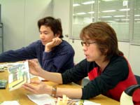 今回お会いした ディレクターの上田さん。 彼の登場で、すっかりICOという ゲームのもつ空気感をナットクできた私です。 どんな空気かというと、 たとえば、ほんわかしながら鋭い感性と 性別や時間を超えるような普遍性をもつ 大島弓子ワールドとか、 スガシカオの歌でいうと、 「黄金の月」が放つ空気の温度や色とか。 (まあ、まーしゃ的勝手な想像ですけど。) なんだか消えちゃいそうなはかなさと 強い存在感が共存してるような そんな佇まい、です。 そして出てくる言葉にドキっとすることも。 ぽわーんとしたやさしい空気と、 「予告編以上の本編はないと思う」というような、 鋭いクリエイター魂を併せ持つ上田さんの世界。 じわっじわっと惹きこまれちゃいました。 クリエイターの持つ魅力がそのまま作品になる っていうのは理想なのだろうけど、 そんな簡単なわけにいかない 壁、壁、壁の連続だろうしねー。 でもそんな壁なんかぶっとばしてしまう、 ICOチームの情熱とか夢とかがひしひしと 私の細胞に浸透してきました。 今日はICOのエンディング(これがまた味がある!) みたいに、未来へつながるいい話になっていきます。 ではどうぞ。 ![]() (上田さんとマサ斎藤くん) ●日本の文化…。