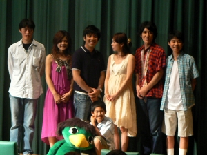 舞台挨拶のときの、左から原監督、主題歌の大山百合香さん、