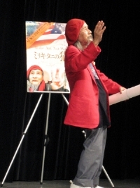 舞台の上で荒貞男『男は泣かず』を朗々と歌うジミーさん