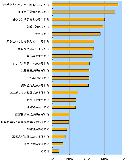 | あれはよかった! 第2回アンケートより。 ほぼにちわ、あややです。 第2回「あれはよかった!」に ご参加くださったみなさま、 ありがとうございました! 第2回は「ほぼ日」の どのようなところがいいのか いっそ、堂々と聞いてしまおう! ということで、 アンケートをさせていただいたのですが、 こちらがおもわず照れちゃうくらいの、 うれしいご意見をたくさんいただきました。 今回のアンケート結果をみて一番驚いたのは、 これほどまでに、みなさまが「ほぼ日」を 宣伝してくださっているなんて! ということでした。 すでに先日、お伝えしましたように、 「ほぼ日」について周りと話していたり、 おすすめしていたりするかについては なんと、80%以上の方が「はい」と 答えてくださったんです! この、「80%以上」という数字、 あらためてみても、かなりスゴイです。 感謝の言葉を伝えるだけでは足りないくらい、 (最敬礼? 足を向けて寝ない、とか??) 感謝しまくりです! ほんとうに、ありがとうございますね!! ではでは、集計内容を しっかりとご報告させていただきまっす。 ●どのように 「ほぼ日」をおすすめしてくれましたか? と自由筆記で伺ったところ・・・・ まず、基本バージョンとして、 「面白かった内容を教えて、 読むようにすすめた。」 「お気に入りに追加してあげた 」 「ほぼ日デリバリー版を メールで転送してあげた。」 「自分のHPでリンクを はらせていただきましたっ。」 みなさまお一人お一人から 網の目のように広がっていくことが、 大きな力になっているんだなあ、 としみじみ思います〜〜。 さらに・・・・ もう少し熱い方は 「ほぼ日というものについて、 同僚と、熱く語り合った」 「オカマの素晴しさについて熱く語りました。」 体育会系な方は、 「読めばわかる、と自力で探させた」 「とにかく見ろ! 自分で調べろ! と伝えました。」 まわりを巻込むタイプの方は、 「昼休みになぞなぞを出題していた」 「ほぼ日を読む時必ず夫を誘ってました」 「メールで紹介して一緒にTシャツ購入」 もっと広く世の中に!という方は、 「会社の朝礼で紹介した」 「会社の社内報でほぼ日を紹介した」 「授業の教材に使った」 「勤務先や出張先のコンピュータすべて、 お気に入りに追加しています」 最後の、勤務先や出張先のコンピュータに、 軒並み「ほぼ日」をブックマークしちゃった、 って・・・・その強引さ、素敵です。 さらに、パソコンから離れて、こんな方も・・・ 「冷え性の友人に 突然ハラマキを送りつけてやった」 「ほぼ日を教え、本を教え、 Tシャツをプレゼントした」 「カップ麺をおすそわけした」 オトナ語的にはシェアするというのでしょうか、 どうもありがとうございました!! ここまでくるともう想像を超えています。 「『あなたの知っている糸井重里は、 本当の糸井重里ではないんだよ。』 と伝えた」 うーん、すすめ方は人それぞれなんですね〜〜。 続きまして、 ●「ほぼ日」のどのようなところをみなさんは 喜んでいただいているのか、 ベスト10で発表します! (複数回答で答えていただきました。)