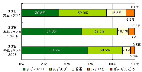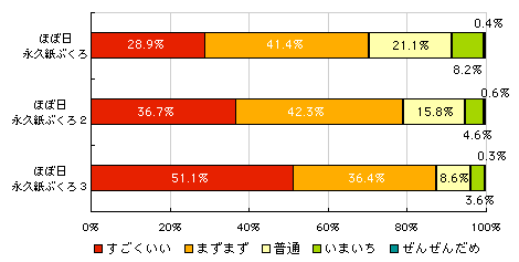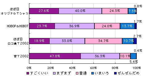 まず、「ほぼ日ストア」で お買い物をしたことがある商品について、 満足していただいているかです。 ●ほぼ日永久紙袋シリーズ ![]() 商品名だけだと、持っていない方は わからないですよね。 ここで、ちょっとそれぞれの商品について おさらいをしつつ、商品の開発担当者に聞いてきました! ●ほぼ日永久紙ぶくろ(2000.1〜) 赤門1号、青山通り1号、黄門様1号という3色から はじまったのです。 ●ほぼ日永久紙ぶくろ2(2001.6〜) 色がマリリン/ピンク、モカさん/茶、黒い紳士/黒に 変わりました! ●ほぼ日永久紙ぶくろ3(2001.8〜) 把手(とって)を20センチ長くして、 肩からかけられるようにしました。 色は88/ベージュ、アマクサ/白、ワイルドピッチ/濃紺 ほぼ日永久紙ぶくろ3では、 大きな改良ポイントがあったんです。 それは、「肩にかけられる」という点でした。 『紙袋』というコンセプトからははずれてしまうので、 おおいに悩んだのですが、 読者のみなさんからのメールでも多かったリクエストでしたし、 じぶんたちも、短い把手は「う〜ん」と 思っていたことだったので、 思い切って変更をしたんでした。(実際とても便利!) それが、数字に表れていて、とてもウレシイですねえ。 (モギモギコ) ●ほぼ日オリジナルTシャツシリーズ 毎年テーマを変えて作っているので、 好みが分かれたのかもしれませんね。 ●ほぼ日オリジナルTシャツ(1999.9〜) ほぼ日初のオリジナルグッズが誕生しました! ●HOBOP&HOBOT(2001.4〜) テーマは脱・ロゴT。 「ほぼ日」のおサル成分をどんどん薄めていっても、 商品として魅力のあるものにしました。 ●ほぼ日ロコ★T(2002.9〜) 遠慮しないで「ほぼ日」関係者ぶりを まる出しにして歩いたりしてもいいじゃない。 露骨に「ほぼ日」を宣伝しちゃってください!という 露骨なTシャツをつくりたくなりました! ●育T2002(2002.4〜) ヴィンテージをめざせ! 着れば着るほど、洗えば洗うほど育つTシャツ、 をテーマに、自分へのメッセージを 上下逆さのletterでプリントしたTシャツでした。 去年発表した育Tの満足度が高いのが、うれしいですね。 注文いただいた数が、 それまでのTシャツより格段に多いんですが、 それでいてこれだけの評価をいただけたのは、 すごく励みにもなるし、 自信もっていいんだな、と思いました。 今年のTシャツ、「最良のふつう」をめざした 「B.S.T.」「B.S.P.」「どせいさんコラボT」が、 もうすぐみなさんのお手もとに届きます。 これについても、見て、さわって、着てみて、 どんなふうにお感じになったか、 教えていただけると、とてもうれしいです。 (Tシャツ特捜部ハリー) ●ほぼ日オリジナルハラマキシリーズ ![]() Tシャツに続いて定番商品となってきているハラマキ。 先日販売をした「ほぼ日Shareona」ハラマキも 大人気でした! ●ほぼ日真心ハラマキ(2001.11〜) “真心タグ”入り。 おサルの絵が入ったハラマキだって、 横尾さんデザインのレンガのハラマキだって こんなハラマキは「ほぼ日」にしかありません。 ちゃんとデザインされて、 ノビフワールで編まれたハラマキでした。 ●ほぼ日真心ハラマキ・ライト(2002.6〜) 軽くて薄くて、しかも、 やわらかいタオルの感触の“のびのびタオリン”素材で、 季節を問わず、お使いいただけるハラマキの登場です。 ●ほぼ日元気ハラマキ2003(2002.12〜) 薄くって、なおかつあったかい。 チェックチェックチェックのおしゃれなデザインに、 本物の“気”が込められました。 販売を重ねるごとに、 ハラマキをよろこんで巻いてくださっている ご様子が伝わってきて、 とっても、うれしいです! 先日まで販売していた、 「ほぼ日Shareonaハラマキ」も、大好評で たくさんのみなさまにご注文いただきました。 ただいま、新潟のトノサマくんチームのみなさまが、 一日でも早く、みなさまのお手元にお届けすべく、 毎日、じゃんじゃん編んでくれています!! どうぞ、楽しみに、お待ちくださいね。 (あやや) ●ほぼ日手帳シリーズ ![]() ●ほぼ日手帳2002(2001.10〜) 世界一の手帳を目指して、送り出した第1弾です。 ●ほぼ日手帳2003(2001.10〜) 2002年版より、見た目も使い心地もバージョンアップした 第2弾です。 「ほぼ日手帳」は、みなさまから 「こんなふうにして欲しい」というご要望を、 ほんとうに、たくさんいただきます! みなさまからのご要望をお聞きするたびに、 より多くのみなさまに満足してもらえるような 手帳にしたい、という思いが どんどん強くなっていきます。 現在、来年度の手帳を製作中ですが、 次回も、さらに多くのみなさまに満足していただけるよう、 しっかりと、作っていきたいと思っています。 どうぞ、よろしくおねがいいたします! (あやや) お買い求めいただいたみなさま、 どうもありがとうございます。 これからもシリーズ商品は「定番化」しすぎることなく、 常によりよいものを求めてチャレンジを続けていきます! つぎに、商品によってお買い求めいただく理由と、 実際の商品が手元に届いた
