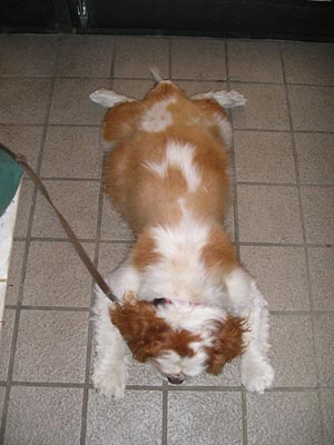 美容室の玄関に寝そべり、女性客のハイヒールに
