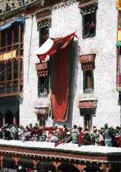 宗教画であるタンカが開けられるのを、