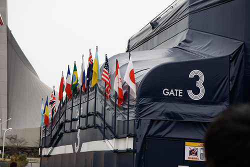 ゲートにひるがえるさまざまな国旗。