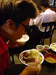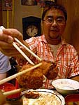| <たかがコロッケ、されどコロッケ> ここ最近の鼠穴の昼食っていうのが そーめんをいかに味付けして楽しむか? ってことに焦点をおいているんです。 まぁいくら夏だからっていってもそーめんばかり続くと 人間すかすかになってしまいますから、 不思議なもんで、だんだん身体が油を欲してきたんですよ。 ちょうど「うまいコロッケの店」を募集してんじゃん! と気付いたぼく(ROCK西本)は読者からの 投稿をチェックしてみました。 するとね、鼠穴(東麻布)の近くの応募があったんですよ。 西麻布にある三河屋さんってお店。 でもね、この応募には どんな味なのかは書いてなかったんです。 そこで4半世紀と8年を都内で生活する 都内先輩のdarlingに聞いてみました。 「コロッケの旨い店で西麻布の三河屋さんってのが 来てるんですけど知ってます?」 するとdarlingが 「三河屋ね。あそこはいいよー。 この前、俺、雑誌で紹介したよ、メンチのほうだったけど」 その後三河屋についてレクチャーを受けていると、 「じゅるっ」 背後に怪しい気配を感じました。 振り返ると、デブ兄弟社(シェフ武井、金さん)の二人が! 「にしもっちゃん、明日の昼飯決まりっすよ」 デブ兄弟社の二人にとって そのレクチャーはたまらないものだったらしく、 翌日、普段よりちょっと早めに出社して、 スタッフ総出で西麻布にでかけました。 三河屋さんは西麻布交差点のすぐ近所、という情報どおり すぐにお店はみつかりました。 ![]() こんな感じ が、既に人が並んでます。 どうやら人気のあるお店のようです。 我々もメニュー看板を横目に想像を膨らませながら 並ぶことにしました。 ![]() 腹減った! 中をこっそり覗くと山盛りに積まれたキャベツが! するとトビラが開いて、おかみさんが注文を とりはじめました。 ![]() ほらごらん、キャベツだよ ミックスコロッケ!海老フライ!とんかつ! と各自お互いのメニューを少しづつ分け合うことを 約束してメニューを決めました。 因みにぼくはとんかつを選択。 darlingの「あそこはとんかつもうまいんだよ」 って言葉を記憶してたんでね。 10分程待つと、お店の中に入れました。 予め、注文をしておいたので すぐにとんかつもやってきました。 各自のメニュー交換もそこそこに 早速、食べはじめました。 がっつきすぎて、画像押さえるの忘れてやんの。 ![]() がつがつがつ コロッケの味の方はというとこれが「旨い!」 表面が堅くて、なかがほくほくしてるの。 スーパーとかで売っている 「べちゃっ」としたものじゃぁないんだ。 メンチカツの肉汁なんてたまらないのよ。これが。 更に旨いだけでなく、量も多いんです。 キャベツ山盛りにマカロニサラダ、漬け物、味噌汁 御飯という豪華メニュー。 これで1000円足らずですから安いですねえ。 コロッケは新じゃがが入荷したばかりらしく 「いっぱい食べてねえ」とおかみさん。 おいおいいいのかよと思いながら、ちゃっかり御飯を おかわりしちゃいました。 すると、「今日は新米だから遠慮せずに言ってねえ」と さらにどっちゃりよそってもらいました。 質、量ともにこだわるデブ兄弟社もこれには御満悦。 そこで感想を聞いてみました。 ●金さん いや〜、ひさしぶりに良質な脂に出会いました。 肉汁っていうの? メンチカツをカプっといったときに 口にひろがるスープ。 たまらんす。 ●シェフ武井 わらじ型、ではなくて手りゅう弾型、 というかゆでたまご 型、なんだね〜。 衣が薄いのにカリっとして丈夫で、型くずれしないし。 しかも中はほっこり。 ぜんぜん脂べっちょりのかんじしなかった。 ソースをつけずに紙で包んで、 歩きながらかじりたいくらい。 メンチもジューシーでうまかったです。 ゴハンとキャベツも、すごくおいしい。量も多いし。 ![]() シェフ武井御満悦 ●もぎカエル部長 コロッケはうまかった。 たべるのがたいへんなくらい たくさんでてきた。 ワタクシが食べたのはエビフライ+コロッケ1ですが、 いや、なんつうか、中身が充実。 ご飯はシェフ・武井とROCK西本にたべてもらいました。 オカズだけで満腹です。 これで雰囲気伝わりました? シンプルな料理だけに コロッケって侮れないところがあるんだなぁ。 みなさんのお近くにもナイスなコロッケがあったら 教えて下さい。 それではお待ちしてま〜す。 三河屋データー 港区西麻布1ー13ー15 11:00〜14:30まで営業。 土日はお休みみたいです。 ライスが無くなり次第、終了らしいのでお早めに。 |