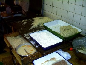 上からコロッケ(揚がる前の)、小麦粉(?)、
