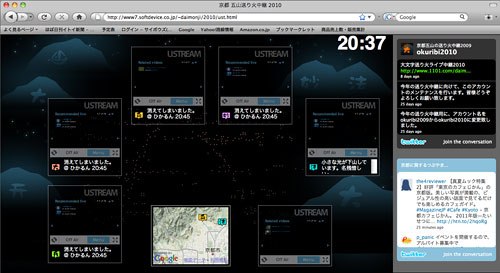 そしてメインはこちら。 世界初の「Ustream五山同時中継」です。 映像で中継するスマート中継員さんと、 テキスト+写真で中継するケータイ中継員さん、 2人が協力しあいながら、 「『妙法』の法」「舟形」「左大文字」「鳥居」を、 中継してくれます。 のこりの山のうち「右大文字」は、 ソフトディバイスさん事務所からUstream中継、 「『妙法』の妙」は、ソフトディバイスのスタッフが 山の近くまで行って、 iPnoneでUstream中継してくださいます。 いったいどうなるか、 やってみないことには、まったくわかりません。 すこしでも、ぜんぶの山が観られるときがあると、 いいんですけどねー。