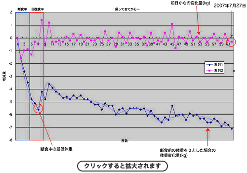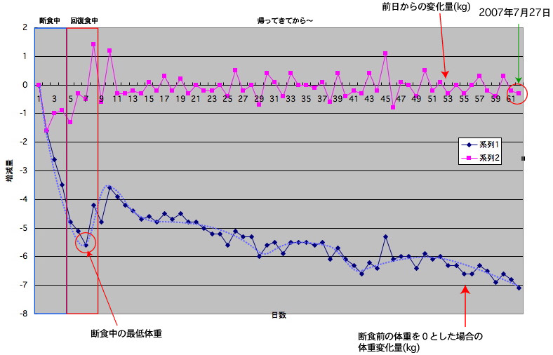 断食に行ってからちょうど2ヶ月がたちました。 食べる量もそれなりに普通になってますし、 脂っこいもの以外なんでも食べてます。 (缶コーヒーはほとんど飲まなくなりました) その結果、体重はどーなったか。 リバウンドしたか、止まったか、まだ減ってるか。。。 結果は図のようです。 まだ落ちてます。 特に運動をしているとか食事制限をしているというわけでもなく、 もー、だいぶ夜型にもなってきたしで、 特に何かしてるわけでもないんですけど、 ゆっくりゆっくり落ちてます。 知らず知らずのうちに食事の質や量が減ったんでしょうか。 それとも体質が変わったんでしょうか。 自分の感覚としては、 前回の断食同様、やっぱり後者を感じるんですよね。 胃腸の感じというより肌の感じがそうというか。 もー、猫に小判、男に美肌、というくらい、 肌の色つやがいいんです(例によって、当者比)。
