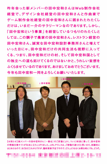 | <2006年新年のご挨拶。> 今年も、あけましておめでとうございます。 たいへんなご無沙汰状態をやらかしてます、 田中宏和でございます。 前回の更新が去年の元旦で、 テーマも同じ年賀状とは、 わたくしが上司の立場ならば、 「とても感心できませんな」と 期末面談で言いたいところであります。 さて、この一年間のわたくしですが、 敵対的買収に明け暮れることも無ければ、 偽装に偽装を重ねることもなく、 ささやかな誤発注をしながら、 ごく普通にあわわわただただしい一年を送っていた、 ということでお許しいただきまして、 さっそくですが、 田中宏和同姓同名年賀状コレクション 2006初春のご紹介です。 2002年年末の留守番以来、 「ほぼ日」において、 年賀状の電子的配信を行い、 毎回多くの田中宏和通報をいただいてきました。 去年は、4人目の田中宏和さんとの出会いがあり、 Web制作会社経営の 田中宏和急進派とも言えるメンバーにより、 年末には田中宏和情報交換ブログまで 立ち上がった始末。 もはや時代の波に翻弄される、 田中宏和運動であります。 10年以上、同姓同名年賀状の アートディレクターを 勤めてくれている友人によりますと、 年々気持ち悪さが増しているそうです。 つまり、順調な成長を遂げております。 新年の目標としましては、 動画配信でもポッドキャスティングでも かかってこんかいの意気込みで、 ぜひ世界の同姓同名ムーブメントに 一石を投じることを目標にしたいと 思うわけであります。 新年早々にも田中宏和集会を行いますので、 お心当たりのある方は、 気持ちの準備をお願いします。 今まで「ほぼ日」にメールをいただいた、 田中宏和のみなさま(10人超)にも ご案内したいと思います。 みなさまにとって、 すばらしい一年となりますことを、 全国の田中宏和を代表してお祈りしております。 そして、田中宏和を発見の際には、 ご一報をお願いします。 ![]() |