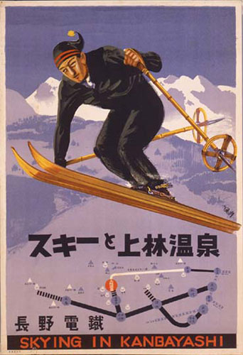長野電鉄は、河東鉄道と 長野電気鉄道が合併して 大正15年(1926)に設立された 鉄道会社です。 沿線の温泉とあわせて スキー場の案内をしています。 わが国におけるスキーは、 20世紀初頭、軍事訓練の場と、 学校教育の場で 紹介されました。 大正12年(1923)にはじめての 全国大会が開かれ、 昭和3年(1928)に オリンピックに選手団を 送るようになると、 冬のスポーツとして 認知されるようになりました。