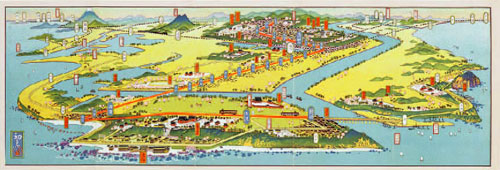 これは水浜(すいひん) 電車と言って、 今の水戸の辺りを 走っていたちんちん電車です。 やはり水戸を中心に 空間をねじまげているわけですが、 茨城ですから筑波山が見える。 並ぶように富士山が見える。 北海道の鳥瞰図に比べて 富士山がちょっと 大きくなりました。