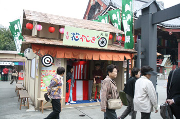 赤い緋毛氈(ひもうせん)が風情たっぷりの食べ物屋さん。