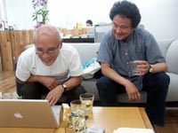 打ち合わせをする村上さんと賢作さん。 |
