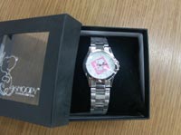 スヌーピーが真ん中にいる、ピンクの腕時計です。