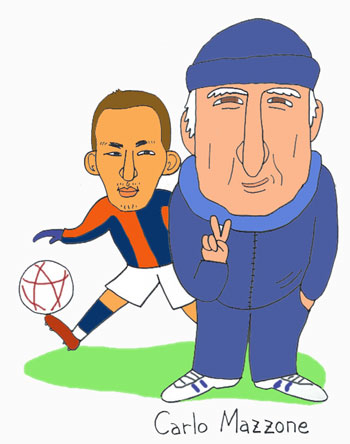 | ボローニャはナカタを待っていた! 「中田英寿は一歩をふみだすだけで、 二歩ぶんの仕事をするチャンピオンだ」 このところ中田が大活躍しているボローニャの、 カルロ・マッツォーネ監督の言葉です。 カルロ・マッツォーネはイタリアの監督の中では 冷静なことで有名な人です。 そして‥‥若いほうではありません。 (「年寄り」と言うと怒るんです。 ただじゃすまない。 だから「若いほうではない」、ね。) 彼はたくさんのチームの監督を歴任してきましたが、 歴史上の3大チームであるインテル、 ユベントス、ミランについては例外です。 にもかかわらず、 彼はイタリアサッカーの巨匠、「偉大なマエストロ」と、 だれもが思っています。 イタリア・ナショナル・チーム「アズーリ」の監督で、 教授とよばれるトラパットーニには、 さすがにかないませんが。 マッツォーネはつねに尊敬され、 だれからも愛されています。 彼が自分の性格を隠さず、ごまかさないからです 偽善的な物言いや常套句などに 逃げこんだりはしません。 白黒をはっきりさせます。 「あいまいな見解」という 都合の良い風よけは、彼には無用です。 そのいさぎよさが、彼の身上です。