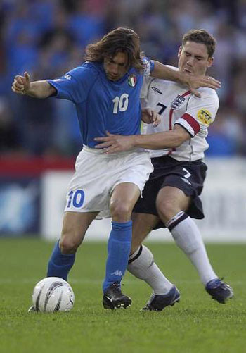 去る3月31日、水曜日には、 アンドレア・ピルロは イタリア・ナショナルチームである アズーリのシャツを着て、 友好試合とはいえ重要な 対ポルトガル戦に勝利しました。 じつは彼は以前にも アズーリのシャツでプレイしたことがあります。 その時はまだユースでしたが、 ヨーロッパチャンピオンにもなっています。 そして、今回のポルトガル戦では、アズーリの トラパットーニ監督が彼に与えていた課題を、 アンドレアは見事にクリアしたのでした。 ![]() さあ、これからが楽しみです。 今後のアズーリの中では、 アンドレア・ピルロはイタリアの 重要なミッド・フィルダーになるでしょう。 彼は、ちょっと後ろに退いたポジションで チームに好機を与える中心人物になるでしょう。 トッティの背後を固める役割をしっかりと果たすはずです。 ACミランはクラブ・チームとして ヨーロッパチャンピオンになりましたが、 アズーリは1968年以来 イタリア・チームとしてヨーロッパチャンピオンの タイトルを取れないでいます。 この悲願のチャンピオンタイトルに向けて、 アンドレア・ピルロはトッティと協力しながら、 一緒にチームを引っぱって行くことでしょう。 イタリアが初めてヨーロッパチャンピオンになった時、 ピルロはまだ生まれてもいませんでした。 月日は流れ、イタリアの新しい才能がまたひとつ、 成熟の時を迎えようとしています。 ![]()
