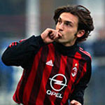 ![]() この移籍は、しかし、 アンドレアにとってはラッキーでした。 ACミランでの彼は、 まるで生まれ変わったように伸びました。 ACミランの赤黒のシャツを着て アンドレア・ピルロは成熟していきました。 彼のプレイは洗練され、 男としても成長しました。 世界中のテレビが彼をインタビューに来るのですが、 彼はもうデビュー当時の内気な少年ではありません。 ビッグな選手だけの持つ堂々たる態度で、 彼はカメラを上から下まで見つめます。 すこしだけ優越感やうぬぼれが垣間見えるのも、 ビッグになった証拠、ですねえ! ![]() ACミランは昨年のUEFAチャンピオンズ・リーグの ヨーロッパチャンピオンですから、 アンドレアもチャンピオンの一員になりました。 そして今から数週間後に終る 今年のセリエAにおいては、 彼の所属するACミランが イタリアのチャンピオンタイトルを勝ち取るでしょう。