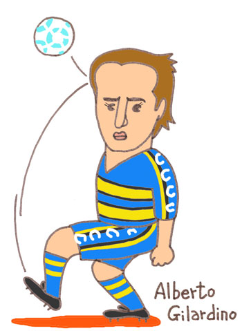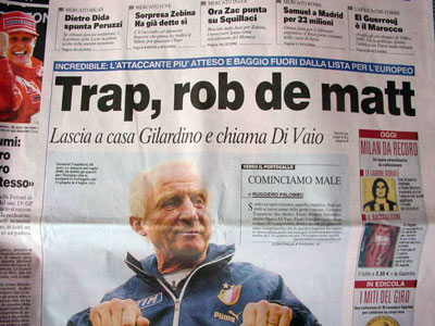 ポルトガル行きに召集された選手のリストを トラパットーニが公表した直後の5月19日朝、 イタリアの日刊スポーツ新聞のなかで一番売れていて 影響力も強いガゼッタ・デッロ・スポルト紙は "Trap, rob de matt"という 大きな見出しを第1面に載せました。 ![]() これはミラノの方言で 「トラップ君、きみはお馬鹿(baka)にしか 出来ないような事をやったね」 という意味です。 彼はイタリアで一番愛された (あえて過去形です) 監督だったんですがねえ、 今は一番憎まれているかもしれません。 若いアルベルト・ジラルディーノが、 ポルトガル行きのアズーリのメンバーに 入っていなかったのには、 みんなが仰天しました。 なぜって、最初に書いたように、 パルマのアタッカーの彼はシーズン中に23ゴール、 それも重要なゴールを決め、 カンピオナートでは偉大な主役だったんですよ。 パオロ・ロッシを彷佛させる、 とまで言われています。 パオロ・ロッシは1978年に、 弱冠21才でW杯に連れて行かれ、 あっという間に主役クラスにかけ登った選手です。 当時ロッシが属していたヴィチェンツァというチームは、 重要とは言えませんでしたから、 同じくあまりぱっとしないパルマで 23ゴールを決めたジラルディーノの UEFAヨーロッパ選手権での健闘も、 みんなが自然に期待していたのです。 ![]() 若かったロッシの場合は、 1978年にアルゼンチンで 「パブリート」という愛称をもらうほどに有名になり、 その4年後のスペイン大会では イタリアを3回目の世界チャンピオンに 導いたのでした。 トラパットーニは、 ジラルディーノはパオロ・ロッシとはちがうと 説明していますが、 誰もこの説明では満足していません。 トラパットーニは、 ヨーロッパ選手権ポルトガル大会での センター・フォワードの役を ヴィエリに当てるでしょう。 予備としてコッラーディというところですか。 カンピオナートでは、 ヴィエリが13ゴール、 コッラーディが10ゴール、 足すと23ゴールですが、 これはちょうどジラルディーノが ひとりで決めたゴール数です。 トラパットーニは 計算ができないんでしょうか???