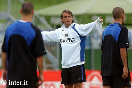 これが発覚した時には、 会社全体がこれ以上ないほどに混乱しました。 さあ、大変!! なんとか解決の手段はないものか? 解決といっても、無理だろう。 莫大な違約金を支払って、許しを乞うのか? いやいや、金で解決できる問題ではあるまい。 かたや、インテルのティフォーゾも多く、 ヴィエリ、アドリアーノ、レコバ、カンナヴァーロなどの 黒青シャツのチャンピオンたちも人気のある日本での、 価値ある国際的な親善試合。 もう一方は、イタリアで行われる 各45分の親善試合がふたつ。 会場のサン・シーロ競技場は、 新監督ロベルト・マンチーニのインテルを見る為の ティフォーゾたちで満席になるでしょう。 これらの試合は、 すでに重要なテレビ局に売ってしまっています。 すったもんだの挙げ句に、 7月14日水曜日、 やっと決断がくだされました。 両契約とも決行!! およそ35人の所属選手が いつでもプレイできる状態を保っているこのチームを、 7月27日は、ふたつに分けようという決断です。 インテルは大チームです。 もちろん正選手がきっちり11名しかいないのではなく、 11名がピッチに入り、すぐにも出場できる状態で ベンチ入りしている選手もふくめた18名が正選手です。 これに予備選手を加えれば、 ふたつに分けても8、9名の正選手を各チームに使えます。 7月27日、ひとつのチームが 日本の埼玉で親善試合にのぞみ、 もうひとつがその9時間後に イタリアのミラノで トロフェオTIMに出場するわけです。