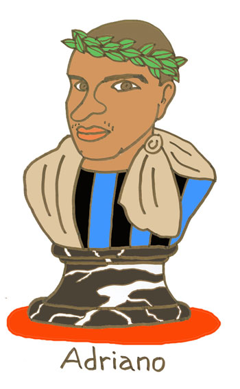でも、勝利の夜のインテルのヒーローは マンチーニ新監督ではなく、 ブラジル人アタッカーのアドリアーノでした。 インテリスタ(インテルのサポーター)の胸は、 かつてのアイドルだった忘れがたいロナウドのあとを アドリアーノが継いでくれそうだという期待で、 大きくふくらんだと思います。 アドリアーノは素晴らしい2ゴールを決め、 会場だったサン・シーロ競技場では、 観客たちが文字通り狂喜乱舞しました。 すでに彼には「皇帝」というニックネームが ついているんですよ。 「アドリアーノ」は、 約2千年前に、ローマ帝国の文明に最高の輝きをあたえた 皇帝の名前と同じなのです。 インテルは、 アドリアーノという名前の現代の若き「皇帝」が、 インテルの過去の栄光を 再びもたらせてくれることを願っています。 ![]()