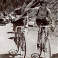 1948年のツール・ド・フランスでの バルターリの大仕事が、 市民闘争をしりぞけたと、 当時の論説は語っています。 こんな話です。 当時のイタリアは共和国になったばかりで、 王はポルトガルに追放されていました。 まだ激動の時代でした。 そして左翼である共産党の党首 パルミーロ・トッリャッティは、 国にたいしてある反撃を企てた、 つまり合法的に選挙でつくられた民主的な政府を ひっくりかえそうとしている、 という疑惑が持たれていました。 それがもとで1948年7月14日、 右翼の熱狂者がトッリャッティを狙撃しました。 共産党を支持していた多くのイタリア人たちが、 労働者階級を守ってくれる人と思っていた そのトッリャッティが襲われたのです。 トッリャッティの襲撃事件のニュースが ひろまるやいなや、 警察と、蜂起した群衆との衝突が懸念されました。 大きな工場の工員たちは、 この国の二大工業都市であるトリノとミラノの道路に、 バリケードをはって抗議する態勢でいたからです。 国のすべての危機管理組織に警告が出され、 何千人もの労働者たちが広場に降り立ち、 一触即発の状況でした。 そこへ「トッリャッティ死亡」の報せが届きます。 心配された衝突は現実となり、 数百人が逮捕され、けが人は250人を越えました。 ![]() イタリアの社会が騒然とする中、 ツール・ド・フランスでのバルターリとコッピの活躍した 忘れ難い一日のようすが、ラジオから流れました。 イタリア人自転車競技選手が 外国で見せた大活躍を知って、 イタリア人たちは誇りに思い、 彼らをほめ讃えました。 第二次世界大戦が終ったばかりの当時、 連合軍としてイタリアと闘ったフランスに対する イタリアのライバル意識はまだ大変に強かったのです。 バルターリがフランスを負かしたことは イタリア人に再び勇気をあたえ、 庇護者であったはずのトッリャッティの 死の衝撃を忘れさせました。 そして、勝利をもたらしたバルターリと、 彼を支えたよきライバル・コッピの 試合の展開の素晴らしさを、 人びとはともに分かち合い、賞賛しました。 この話は、いまだに子どもでも知っているくらいに 語り継がれているんですよ。 その年のツール・ド・フランスで、 このふたりのライバルどうしに何が起こったのでしょう? 実はふたりは大変に仲の良い友人どうしでもあり、 おたがいに尊敬しあっていました。 ![]() ここに、その日の一枚の写真があります。 上り坂で水の容れ物を手渡しているように見えますね。 「コッピがバルターリを助けた」ようにも見えますし 「バルターリがコッピを助けた」というふうにも見えます。 この一枚はいまだイタリアのスポーツ史上の 謎のひとつとなっています。 ライバルに水を贈る、この究極の行為について、 どちらがどちらを助けたのか? という議論は、 長い時を経てなお、結論の出ないままです。 当時は家庭の中でさえ議論になったということです。