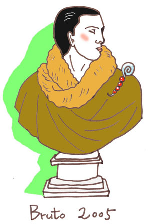 タキシードにポマードで固めた髪、ほほ紅をつけ、