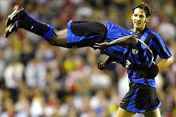 そんなマルティンスのゴールのお陰で、 2月23日のUEFAチャンピオンズ・リーグの対ポルト戦を、 インテルは1対1の引き分けに持ち込みました。 ポルトは昨年のヨーロッパ・チャンピオンであり、 最後のトヨタ・カップの優勝チームですね。 インテルにはアドリアーノやヴィエリなど、 彼よりも強いとされるアタッカーがいますが、 彼の素早さとゴール能力はとんでもないものです。 平均すると71分に1ゴールの割合です。 インテルのオーナーであるマッシモ・モラッティは、 マルティンスがゴールするたびに1万ユーロを 彼にプレゼントするのですが、 それは彼には渡されるのではなくて、 彼の母親と6人の兄弟のマルティンス一家の暮らす ラゴスの地へ、直接送られます。 マルティンスがインテルのティフォーゾばかりでなく イタリアのサッカーファンの誰からも愛されているのは、 自分が楽しむだけではなく、 いつも観衆を楽しませようとする 彼の気持ちの表しかたがあるからです。 ゴールの度に彼は喜びをトリプル宙返りで表します。 これはもう彼のトレードマークになりましたね。 ほんとうに喜びに満ちていて好感がもてます。 ![]() ![]() ![]() ところで、オバフェミという名前は イタリアの観衆たちには長くて発音しにくいので、 彼は「オバオバ」というニックネームで呼ばれます。 リオ・デ・ジャネイロの有名なサンバのバンドと同じで、 でもマルティンスはナイジェリア人なんですが、 ま、固いことは言わない言わない。 もっか彼はミラノで一人暮らしです。 彼を孤独との闘いからすくってくれるのは、 よく食事に招待してくれるモラッティやヴィエリの 家族ぐるみの友情です。 ヴィエリに至っては、 ことオバオバに関する限り、 まるで「親代わり」の気分のようです。 批判から彼をまもり、ミラノの寒い夜には彼を誘ったり、 時には彼をディスコに連れて行くこともあるとのことです。 ディスコの帝王ヴィエリといえども、 あまり夜がふける前にオバオバを家に連れて帰れるように、 ちゃんと気を付けているみたいですよ。 インテルはポルトとの引き分けで 新記録を打ち立てました。 カンピオナート、コッパ・イタリア、 UEFAチャンピオンズ・リーグを通して38試合、 負け無しという記録です。 これはインテルが誇れる快挙です。 幸運なことに、まだサッカーを 純粋な楽しみとして表現している 20才の若いオバオバも、 この記録を誇りにして良いでしょう。 ![]()