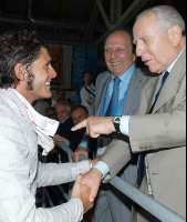 ココはインテルのディフェンダーで、 日韓共催W杯にはアズーリの一員として 日本でもプレイした、あのココです。 ココとマヌエーラの恋物語は、 恋やサッカー選手や王子や王女についての話をのせる スキャンダル雑誌の誌面をにぎわせたものでした。 やはりこのふたりは結婚するだろうと思われた、 まさにその時期に、彼らは別れてしまったのです。 フランチェスコ・ココは淋しさを忘れるために 20才のモデルとつき合い始めました。 そしてマヌエーラ・アルクーリは、 ある夜のミラノで行われた授賞式で、 アルド・モンターノと知り合いました。 マヌエーラと目が会っただけで、 アルド・モンターノは恋におちたといいます。 この恋はすぐに表ざたになりました。 アルドが 「マヌエーラは世界一の美女だ、 だれよりも愛情にあふれている、 彼女がぼくの子どもたちの ママになってくれたらうれしい」 と言う一方で、マヌエーラも、 これと全く同じ言葉で答えています 「アルドは信じられないほど優しい紳士で、 私の子どもたちのパパになってほしい」と。 アテネのオリンピックで金メダルをとった直後、 アルド・モンターノはイタリア大統領の アゼリオ・チャンピの賞賛を受けました。 チャンピは彼と同じくリヴォルノ出身で、 やはりサッカー・チームのリヴォルノの ティフォーゾでもあります。 アルド・モンターノとマヌエーラ・アルクーリは、 あるテレビ番組で彼らの結婚を発表し、 アゼリオ・チャンピを招待すると言いました。 チャンピ大統領が本当にこの招待に応じるかどうか、 まだ返事はしていないようですが。 ![]()