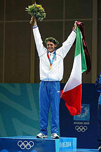 話題の主人公・アルド・モンターノは、 2004年8月14日に、フェンシングのなかでも もっとも伝統的なサーベル(エペ)・フェンシングで 金メダルを獲りました。 彼は表彰台に上がり、メダルに口付けし、 イタリア国歌が流れた時には、 彼が熱狂的に応援しているサッカー・チームの リヴォルノのシャツを、 ひらひらと振りまわしました。 ![]() こうしてマスメディアに登場した このフェンシングの金メダリストは、 若くて、その上にハンサムだったので、 イタリアの若い女性たちは、 すぐさま彼に夢中になりました。 彼は最初は、こうした恋のチャンスを 本気にしていなかったようです。 スポーツのチャンピオンに群がる美女たちは、 スパゲッティのトマトみたいに、 お約束の味付けでしかない、ってね。 でも純情な青年のアルド・モンターノは、 そのなかのひとりの、 ある大変な美女に恋をしてしまいました。 その女性は、これまたスポーツのチャンピオンの、 あるサッカー選手と別れたばかりでした。 最初はなにも本気にしていなかったアルドでしたが、 結局のところ、いちばん美しいトマトを 選んだという次第です。 アルド・モンターノが恋におちたお相手は、 2年にわたってフランチェスコ・ココの恋人だった マヌエーラ・アルクーリでした。 ![]()