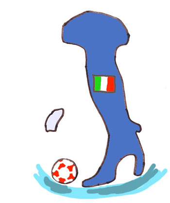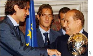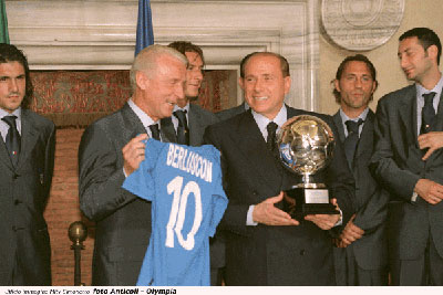 シルヴィオ・ベルルスコーニは、 10年ほど前のイタリアで、 ACミランの、とても人気のある会長でした。 そのチームはイタリアでの リーグ・チャンピオンのしるしのスクデットを勝ち取り、 ヨーロッパではチャンピオンズ・カップを、 世界ではトヨタ杯を勝ち取っていました。 この会長は、スチルカメラやテレビカメラの前で、 偉大な選手たちと一緒に、 彼らの勝利を祝うチャンスを逃がしませんでした。 そしてとうとう選挙に立候補し、 イタリア政府の首相に選ばれました。 彼はこの10年ほどの間に、 勝利し、負け、そしてまた返り咲きました。 ![]() メディア王でもある彼は、 常にサッカー効果を最大限に利用しました。 2002年5月に、アズーリがW杯のために 仙台へむけてイタリアを発つ時のことです、 彼は出発前の代表チームに会ってエールを送り、 お返しにトラパットーニ監督が アズーリの10番のナンバーのユニフォームを 彼にプレゼントしました。 そのシャツには10番をつける選手の「トッティ」ではなく、 「ベルルスコーニ」の名前が書かれていました。 もちろん用意周到なベルルスコーニは、 総てのイタリアのテレビ局が、 その映像を放映するように仕掛けていました。 サッカーが、政治家としての自分の采配に たいへん役立つことを、彼はよく知っていましたから。 ![]()