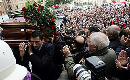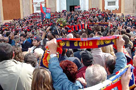 これはジェノヴァのテレビ局からの放映でしたが、 司会者はこの瞬間は、 スコッリョがプレツィオージに抗議するかのように 自ら黙ったのだと思ったようでした。 ところがスコッリョ監督が目を大きく見開いたまま 無表情なのに気付くと、彼に近寄り、頭に触れ、 彼に急な死が訪れたことを理解し、 放送を中断するようアシスタントたちに告げました。 スタジオでこのショーを観ていた観客さえ、 この時はまだ何も気付かず、 コマーシャルの中断か技術的な故障かと思ったそうです。 すぐさまテレビ局のスタジオに 医者と救急車が呼ばれたのですが、 もう、なすすべはありませんでした。 死がスコッリョ監督を連れ去ったのです。 しかも彼がもっとも好きな事をしている時に、 つまりサッカーについて熱く語っている最中に、 死は彼を連れ去りました。 彼がかつて導いた「彼のジェノア」は、 ほかならぬプレツィオージ会長の仕組んだ 八百長のためにセリエCに降格され、 今や泥沼の中であえいでいるのですから、 彼も、どんなにか悔しかったことでしょう。 ちなみに、彼が監督していたころのジェノアには 三浦カズ選手も在籍していました。フランコ・スコッリョが イタリアサッカーのティフォーゾたちに愛されたのは、 彼が「なあなあな順応主義」に抵抗していたからです。 でも特にジェノアのティフォーゾたちにとっては、 彼の熱く血みどろな真の闘いこそが 彼を愛する理由でした。 彼はジェノアの他にも、 国内ではボローニャ、ウディネーゼ、 トリノ、ナポリなどの 有名なチームの監督を務めました。 国外では、リビアとチュニジアの 代表チームを監督しました。 ![]() 何事にも皮肉をからめながら大勢に逆流し、 独自の立場をとることのできる彼の能力を、 テレビは評価していました。 でも彼はこの2年ほどは、 その仕事も制限していたというのに‥‥ 彼は故郷であるシチリアを、 いつも本当に誇っていました。 シチリアの街メッシーナは、 彼に競技場を捧げるそうです。 彼の葬儀は、まずジェノヴァで、 その後、リパリ島でも行われました。 彼が住居をかまえ、こよなく愛した、 すばらしく美しい島です。 ![]() ![]() サッカー監督の生放送中の死は、 サッカー界全体のみならず、 放送を活気づけるためにテレビ局に行く 多くの人びとをも、 激しく揺さぶりました。 たしかにテレビのショーには 「演技」や「お約束」も多いのですが、 スコッリョ監督の場合のように 作り事が現実に変身すると、 あとに続くのは一種の恐怖心です。 いまやサッカーについて語るには、 ちょっとした恐怖がともなうほどです。 ![]()
