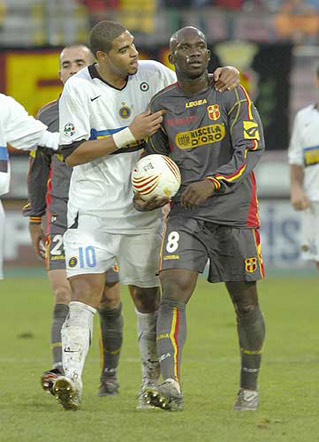 侮辱されたゾロがボールを地面から手にとり、 両腕でしっかりとかかえて 更衣室に続くゲートへ向かった時、 彼のチーム、メッシーナは 2対0で負けそうな状態でした。 ゾロは審判の方を向いて言いました。 「ぼくは、もうプレイしません。 ぼくは人間ですが、 まるで動物のように扱われています」と。 審判が驚いたまま立ちつくしていると、 対戦相手であるインテルの選手がふたり、 ゾロに近寄ってきました。 ピッチに残って試合を続けるように、 ゾロを説得したかったのです。 ![]() インテルの選手、アドリアーノとマルティンスは、 ゾロを抱きかかえるようにして、 自分たちのティフォーゾがゾロに対して しでかした事を、あやまりました。 ![]() アドリアーノの肌はカフェラッテ色、 つまりゾロのより少し明るい色で、 アフリカのナイジェリア出身のマルティンスは、 ゾロとまったく同じように漆黒の肌色です。 「ぼくらも、試合のある日曜日ごとに侮辱されているよ。 でも、だからこそ、ぼくらを猿のように扱う連中に 負けるわけにはいかない。 お願いだからゲームを続けてくれ、 そうすれば、この文化の闘争を一緒に戦えるんだよ」 かれらはゾロを、こう言って説得したそうです。 そしてゾロは、この説得に応じ、 10分後には試合が再開されたのですが、試合後に、 だれもインテルの勝利については話さず、 このアフリカ人選手が目的をもって起こした 態度のことばかりが語られました。 全員が口をひらいて、なんだかのコメントをしました。 翌日には、ヨーロッパ最優秀選手に贈られる バロン・ドーロ賞を、パリで受賞していた ロナウディーニョまでが、 連帯感のこもった言葉を口にしました。 イタリアサッカーの条例は、 重大な人種差別が示された場合に審判が試合を中断し、 その行動が有罪とみなされたティフォーゾを持つチームは 「負け」とされることを、想定しています。 今回インテルは、罰則としての「負け」の判定は 受けませんでした。 しかし、インテルのティフォーゾたちは今後、 もっと礼儀正しく、たしなみのある態度をとるべきです。 そうでないと、この次には、たいへんに重大な罰則が 課せられる可能性もあります。 インテルは、 昨年度のUEFAチャンピオンズ・リーグ試合中に、 ティフォーゾが発煙筒をACミランのゴール・キーパーの ディーダに、命中させる事件を起こしました。 そのことに対するペナルティーで、 同選手権の今年度最初の4試合は 無観客で行いました。 その発煙筒騒ぎにたいするの罰の後で、 さらに重大な罰則をうける悪夢が、 いまやインテルを待ち受けています。