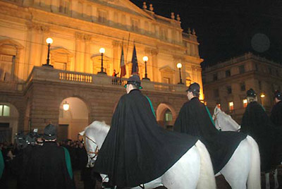 イタリア首相のシルヴィオ・ベルルスコーニも、 その来場が待たれていたのですが、 彼はスカラ座の初日には、 あまり行きたくないと思ったようです。 彼の政府が超不人気の時期にあることから、 抗議でもされてはかなわんと、腰が引けたのでしょう。 ともかく、その夜は世界的なお祭りのようでした。 60年代初頭の「甘い生活」を彷佛させました。 フェデリコ・フェリーニがフィルム上に巧みに表現し、 オスカー賞を勝ち取った、あの甘美で誘惑的な空気が、 ほんの一晩だけ、ローマではなくミラノに漂いました。 現実的には、イタリアは今、他の西側諸国と同じく 大規模な不況の中にあります。 でもスカラ座の初日は、 ショーウィンドーの中にでもいるみたいに、 いつも着飾って注目されたいらしい人びとにとって ねがってもない「おいしい」 チャンスだっとことでしょう。 イタリアだって、かれらから 搾取されてばかりはいません。 たまにはこうして、お金を吐き出させなくちゃね。
