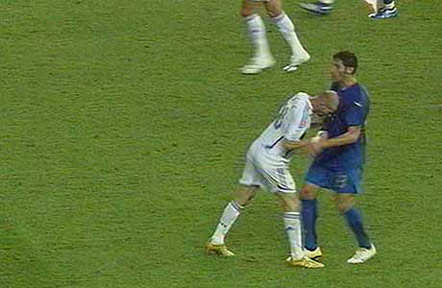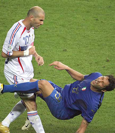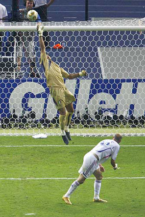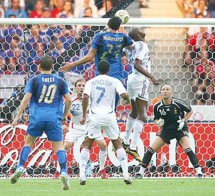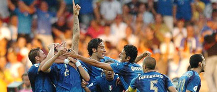 試合開始数分後に、 マテラッツィの取られた充分におめでたいPKが ジダンに決められてしまった時には、 フランス優位の進行が約束されたかのようで、 アズーリたちにも落胆の気配が走りました。 いや、それ以上に、 ほんのひとつまみとはいえ「失望」すら 生じさせたにちがいありません。 しかしアズーリも 誇りを賭けたリアクションを起こしました。 失態をしでかしたマテラッツィ自身のヘッドによる 素晴らしい同点ゴールがあり、 闘いはそのまま延長戦へともつれ込みました。 ![]() この大会最高のゴールキーパーであることを 全てにおいて決定付けたブッフォンのセービングも、 フランスの怒濤の攻撃をかわしました。 これは、もちろん大変なことです。 ![]() サッカーの神々のひとりである炎のジダンが、 彼の現役最後となるこの試合で、 いくどもイタリアを葬り去ろうとしましたからね。 そしてジダンは、 マテラッツィに対する頭突きで レッドカードを受ける結果になってしまいました。 ![]() ![]() ついに優勝の行方はPK戦に託され、 イタリアは5本ともを完璧に叩き込みました。 イタリアの勝利です。 イタリアにとっては 4度めの世界タイトルの喜びが、 アズーリを包み込みました。 ちなみに、これはブラジルより1回少なく、 ドイツより1回多い優勝回数です。 1934、1938、1982、そして2006が、 イタリアサッカーの歴史に刻まれました。 アズーリを率いたマルチェッロ・リッピ監督は、 いちばん大事なレースで勝利を納めたレーサーのような ハンドルさばきを見せました。 スクデットの数々、 UEFAチャンピオンズ・リーグ、 そしてトヨタカップを勝ち取った時のように、 リッピは今、W杯をも勝ち取ったことになります。 かつてなかったほど惨澹たる現状のイタリアの、 でもシンプルで混じりけのないイタリアの、 機械化され過ぎてもおらず ビジネスに総てを売り渡されてもいない部分のサッカーが 勝利したという印象を、ぼくは受けました。