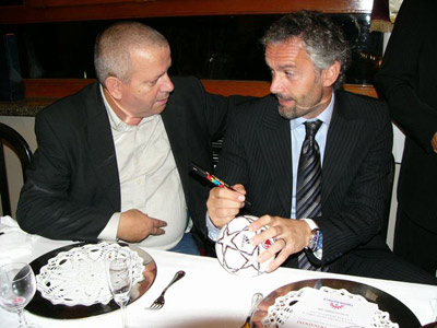 | アズーリ新監督、 ロベルト・ドナドーニへのインタビュー。 先日ぼくは、あるパーティーに出席しました。 主賓はイタリア代表チームであるアズーリの 新監督、ロベルト・ドナドーニ氏で、 そのパーティーは、まさに彼の故郷で開かれました。 ミラノの北東に位置するベルガモの近郊にある、 チザーノ・ベルガマスコという街です。 少し風のある涼しい秋の宵でした。 その晩餐会は招待によるものでしたが、 チャリティーで集められるお金は、 視覚障害のある子どもの病院を援助するために 寄付されることになっていました。 W杯に優勝したチームを監督するという 困難な遺産を引き受けたロベルト・ドナドーニですが、 このパーティーでの役割も大変に感激して引き受けました。 選手たちも参加したかったことでしょうが、 金曜日の夜に催された会でしたから、 次の日にはカンピオナートを闘う選手たちにとって、 スケジュール的に出席は無理でした。 でもカカとインザーギは自分のシャツを、 お馴染みのオークションのために出品していました。 カカのシャツは1500ユーロ、 インザーギのは1600ユーロの値がつきました。 1600ユーロで24万円弱ですから、 とても良い値段ですね。 でもそれ以上で最高額を付けたのは、 もう1人の世界チャンピオン、 ジェンナーロ・ガットゥーゾのシャツです。 2200ユーロを支払ったのは裕福なお医者さんで、 そのシャツをご自分の10才の息子のために 競り落としたとのことでした。 ![]() ドナドーニ監督自身は、 200ユーロで渡される小さなボールと、 100ユーロの何枚もの写真にサインしました。 ![]() この夜、 選手たちのシャツやボールや写真の代金と、 そして晩餐に参加した人びとの寄付も合わせて、 視覚障害の子どもたちの病院に贈られるのは 10万ユーロを超える額となり、 誰もが幸せそうでした。 ![]()