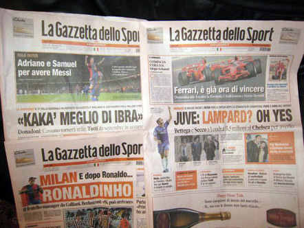 ここ数日間というもの、どの新聞もテレビも イタリアのこの3大チームに関わる話以外で 読者や視聴者を引き付ける話題を 持っていませんでした。 インテルは、打ち負かされる事も、 並ばれることもないであろう差をつけて、 スクデットを勝ち取るでしょう。 向こう何年その「差」が続くのかは、 だれにもわかりませんが。 そしてインテルのモラッティ会長は、 来シーズンのスクデットとヨーロッパタイトルのために、 チームをより強化し、 最高に強いものにしようとしています。 ACミランは現時点ではとても落ち込んでいますが、 来シーズンにはインテルと互角に闘うに足りる骨組みを、 ブラジル人チャンピオンであるカカやロナウド、 そして世界チャンピオンであるピルロ、ネスタ、 ガットゥーゾらを中心に、築こうとしています。 ユーべは、イタリアでどのチームより多い ティフォーゾたちに、 審判買収のペナルティーで セリエBに降格されたこの1年を 忘れさせねばなりません。 インテルのモラッティ会長の夢はリオネル・メッシ、 ACミランのベルルスコーニ会長の夢はロナウジーニョと、 それぞれそういう名前らしいのです。 そしてユーべのアニェッリ・ファミリーは、 チェルシーのランパードと契約するための、 あらゆる準備を整えているようです。 ![]() メッシを手に入れるために インテルがバルセロナへ提示したのは、 3000万ユーロに加えて アドリアーノとサムエルを付けるという、 内容の濃いものです。 ロナウジーニョ獲得のためのベルルスコーニの提示は 金銭だけですが、その数字は実に1億ユーロです。 これだけ積めばバルセロナも、 この別格選手を手放しても良いという気に なるかもしれません。 ユーべはUEFAの条項を通してランパードと接触しており、 1150万ユーロぽっきりで 彼をチェルシーから自由にできるかもしれません。 ランパード選手に対する提示は、 1シーズン500万ユーロで5年契約です。 イタリアサッカーの3大チームが かれらの夢を叶えられるかどうか、 だれにもはっきりと予測できません。 でも、それぞれのティフォーゾたちは、 すでにその気です。 次回のメルカートは、 インテル、ユーべ、ACミランのつばぜり合いが 話題の頂点になることでしょう。 まさにイタリアサッカー黄金期のころのように。
