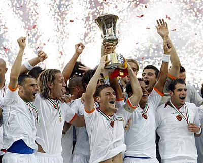 トッティの大活躍!![]() イタリアサッカーの1次リーグ、セリエAでは、 インテルの優勝がすでに決定しています。 そしていまだにどのチームも成しとげていない コッパ・イタリア3連覇に挑んだインテルでしたが、 それを阻止したのは、 昨年度はインテルに負けたASローマでした。 このイタリアの2番目のカップである コッパ・イタリアは、 トッティがキャプテンをつとめる ASローマが勝ち取ったのでした。 1回戦はローマが6対2という怒濤の勝利をおさめ、 2回戦ではインテルが勝利しました。 しかし2対1という結果では コッパ(カップ)には手が届かず、 わずかに一矢報いるに終りました。 キャプテンのフランチェスコ・トッティは コッパ・イタリアをサン・シーロ競技場の空にかかげ、 その数日前に生まれた娘(有名な香水と同じ名前です。 その話は最後にでも‥‥)に捧げました。 父親トッティは、偉大なチャンピオンの名声を保っています。 UEFAチャンピオンズ・リーグでもASローマを 準々決勝戦にまで進めましたし、 今回のコッパ・イタリア獲得もそうですし、 インテルに次いで2位に付けたカンピオナートでも、 ASローマに今シーズンの 素晴らしい結果をもたらした主役です。 これは来シーズンにも大いに期待できます。 ASローマは更に野心的な目標を持って 来シーズンをスタートさせるでしょう。 面白いことになってきました。 ![]() ▲よろこぶASローマのスパレッティ監督。 ▼渋い顔のモラッティ。 ![]()