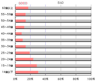 どうですか? 「銀行」って。 リクツはとにかく、自分自身の気持ちが、 こいつをグッドイメージ(GOOD)でとらえているか、 バッドイメージ(BAD)でとらえているか、 率直に答えてください。 どちらでもない、という気分の場合は、 むりやりにでもどちらかに決めてくださいね。 ついでなので、年齢層と性別と地域もクリックしてね。 あとで、傾向なんかを探ると、また遊べそうだから。 ついでに、テーマとしてとりあげてほしいモノゴトも 募集いたします。 宛先は、メールで [email protected]まで。 タイトルは、必ず、「モノゴト」としてくださいね。 (締め切りは、3日(火)中です。 次の更新は9月8日(日)の予定です。) |