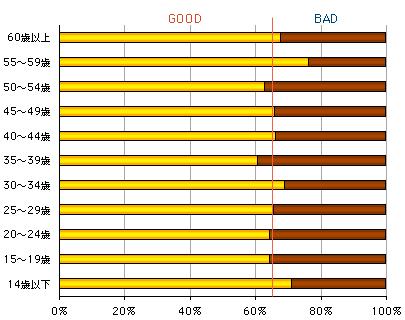 年齢別のGOOD or BADです。 全体の集計である、GOOD65.3%、BAD34.7%のところに 赤い線を入れました。