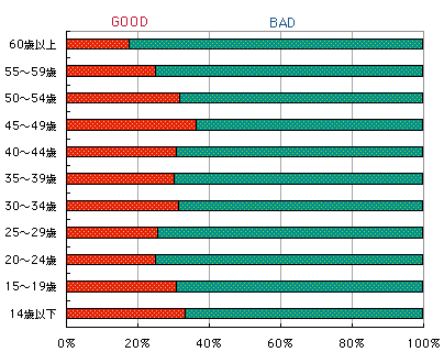 さらに今回は、「ほぼ日」”ひとりっこ班”の シェフと通天閣からも、結果を見てのコメントがあります。 「7割の人がBAD!うっそー! BADのメールを読んでいるとちょっとへこんできました。 みなさん、ひとりっこは「集中力」あるんですよ! 小さい頃から何者かに邪魔されることがないですから。 それから「想像力」もありますよ! 小さい頃からひとり遊びのプロでしたからね。 わたしは、大きな鏡の前に立って、「料理番組のマネ」 とか「電車に乗っているOLのマネ」という芸を 定番でやっていました。 ああー、ひとりっこはいいわ〜。さいこう。 でも自分の子供はたくさん欲しいと昔から思ってるのは なんででしょうねえ。ぅがんばりまーす!!!」 「小さい頃、母親に訊かれました。 「弟か妹、欲しい?」 「いらなーい」 「どうして?」 「雑誌のふろくとか、とられちゃうもん」 なんてわがままな、 ひとりっこ的な意見だこと。 結果、ひとりっこになりました。 僕はたしかに「わがまま」なところあるけど それって「ひとりっこだから」なのか、 わかんないんですよ。ちがうんじゃない? ともあれ、ひとりっこであることに、 自分の選択もかかわっていた僕は、 やだなあ、と思ったこと一度もないです。 ひとりでいるのは苦じゃないし、 誰かと過ごすのも、同じくらい好きです。 ちなみに、仲のいい友人とかって ひとりっこが多いです。 しかし、そっかー、BADか〜。 そんなに悪いもんじゃないですってば〜。」 年代別に見てみました。 未成年の方と、今まさに子どもを育てている年齢の方に 「GOOD」が多いようです。