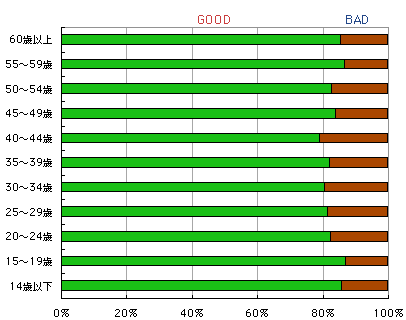 圧倒的な差がつきましたが、 年齢別では以下のとおりです。 30代から40代でややBADが多くなっています。