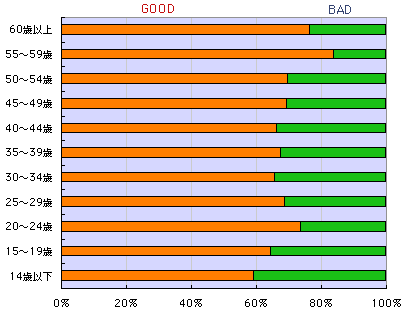 海外からの投票に、ぐんとGOODが多いようです。 みなさんからのメールを紹介します。 今回は、十代の方からメールをたくさんいただきました。 ■■■■■■■■■■■■■■■■■■■■■■■■■■■■■■■■ 日本、いいと思います。 曖昧なのも、自分の意思をはっきり伝えないのも 日本の美徳ですよ美徳。 アメリカ人やらは、よく 「日本人は自分の意見をはっきり言わないし、曖昧だ」 とか言いますけど…それは読み取れないオマエらが 悪いんじゃー! と思っちゃいますね。 日本人には“人の心を慮る”というですね、 繊細な脳があることを誇りに思います。 日本語だって好きです。ひらがな、カタカナ、漢字。 沢山あって面倒だけど、それだけ表現が 豊かというわけで。 例えば同じ「美しい」でも 「うつくしい」、「ウツクシイ」、「美しい」 では、それぞれ違う美しさを表すことができると思います。 なんて素晴らしいんでしょう! 日本人に生まれてよかったと思いますねー。 もっとこういうイイとこ、世界中に自慢すればいいと思う のですが、それをしないのも、イイところ。 (kayo・長崎県) 躊躇することなく「BAD」に投票しました。 好きなところ、素晴らしいなと思うところ、 たくさんたくさん、もちろんあるんです。 日本人に生まれて良かったと思うことも たくさんあります。 でも、いわゆる「弱者」に対しての政府の姿勢 ・社会の対応、「自分の意見」を持っていない外交、 数々の「この国の問題」に見て見ぬ振りを 決め込んでいるかのような国民性など、 見聞きするたびに、やりきれなさで一杯になるんです (乱暴に一括りにして話している点はご勘弁ください)。 だからどうしても、悲しいんだけれど、「BAD」。 わたしが「日本」に対して批判的な目を 向けるようになったのは、 旧日本軍のアジア侵略行為について、 学校で一切教わらなかったことの衝撃から始まっています。 わたし(34才)は学生のときに、 第2次世界大戦について「関東大空襲・沖縄地上戦 ・広島長崎への原爆投下」で敗戦した可哀想な日本、 と教わったので、その後、旧日本軍が何をしてきたのかを 知ったときには、大人達への怒りと不信感で 一杯になりました。なにを被害者ぶっているのだ、と。 「関東大空襲・沖縄地上戦・広島長崎への原爆投下」 などの悲惨さを伝えることは、 戦争の悲惨さ無意味さを知らせる意味で もちろん大切なことですけど、自分達「日本」の加害行為を 隠し続けていたことが、とにかく許せなかったんです。 あれから今まで、その「大人達への怒りと不信感」は、 一度も消えたことがありません。 過去のことも、現在行われていることも、 あまりにも他者を馬鹿にしている、この国「日本」。 このまま変わらないようなら未来は暗いなと 思ってしまうのです。 今わたしは、一人一人はそうではない、ことが救いで、 草の根的にいろいろ活動しています。 一人一人と接していると未来は明るいと思えます。 (かちがらす・佐賀県・女性・34歳) 悩みましたがBADに投票します。 住みやすいし、田んぼや畑が広がる田舎の風景は好きだし 物は豊富だし、食べ物はおいしいし、 友だちだっていっぱいいるし、 別に嫌いじゃないです。 でも、時々イヤになることがあります。 例を挙げると、仕事で打ち合わせをしているとき、 話し合いがなかなか前に進まないんです。 「これもいいけど、Aさんの案もいいし・・・ どうしようか・・」という感じです。 私も自分の意見は言うけど、アシスタントという私の立場上 「じゃあ、これで決まり!」と言うわけにもいかず 上の人が決定を出すのを待たなければいけない。 打ち合わせに限らず、他の仕事上でも ごはんを食べに行くときでも なかなか、みんなが自分の意見を言わないときに イライラした私が「私は○○○がいいと思いますけど」 なんて言うと 私の上司は「一番下っ端なんだから出しゃばっちゃダメ」 という目で見ます。 私の性格のせいもあると思うのですが 同じようなことでイライラしてる人は たくさんいると思います。 こういうことって、日本だけだと思うのですが。 それから、これはちょっと 日本を好きじゃない理由としていいのかどうか 分かりませんが・・。 遅刻魔の私は、ヨーロッパやハワイなどに住む人の 時間に惑わされないゆったりした考えや、 行動が羨ましいです。 集合時間に平気で1時間、遅れてきたりとか・・・・。 いいなあ・・・。 (24歳 女性) Goodに1票いれました。 離れてわかる物事の良さというのでしょうか、 親のありがたみもそうですが、 日本というのも同じようです。 日本と聞いて思い浮かべるのは、 ほんだしの宣伝にありそうな、 湯気のたつ台所とお母さんのエプロンでしょうか・・・。 アメリカの田舎町では日本の白米を仕入れるにも 車で2時間、高速をまともに走れる車を持たない 私にとって、真っ白い炊きたてのご飯に 生卵をぽんっと割ってお醤油をかけてたべる ”たまごごはん