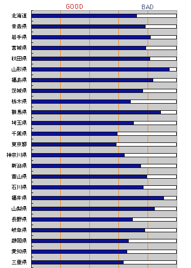 都道府県別の割合を見てみました。 東京周辺と大阪周辺は、人口が多くて 道路が混雑する、空気が悪くなるなどの理由のためか、 あまりGOODイメージが多くありません。