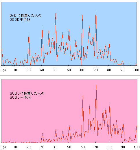 今回はみなさんにも、GOODが何%かを 予測してもらいましたので、 「BAD」と「GOOD」それぞれに投票した人別に どのくらいの予想が多かったのか、グラフにしてみました。 GOODに投票している人は、 結果もGOODの率が高い、と予想した人が多いことが わかりました。 BADに投票した人の方が、幅広い範囲の結果を 予想していたようです。