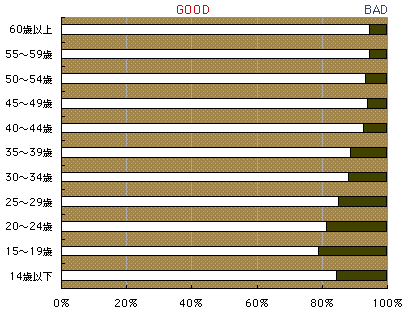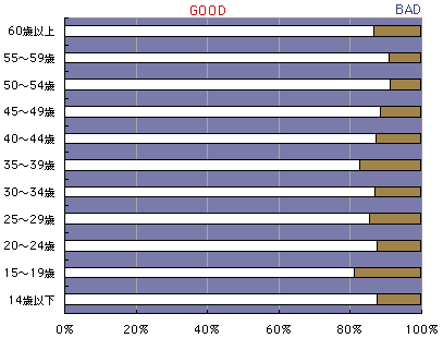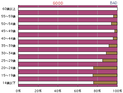 40代以上に、GOODが多いですね。 男女別でも集計してみました。 男性よりも女性の方が、世代差がありました。